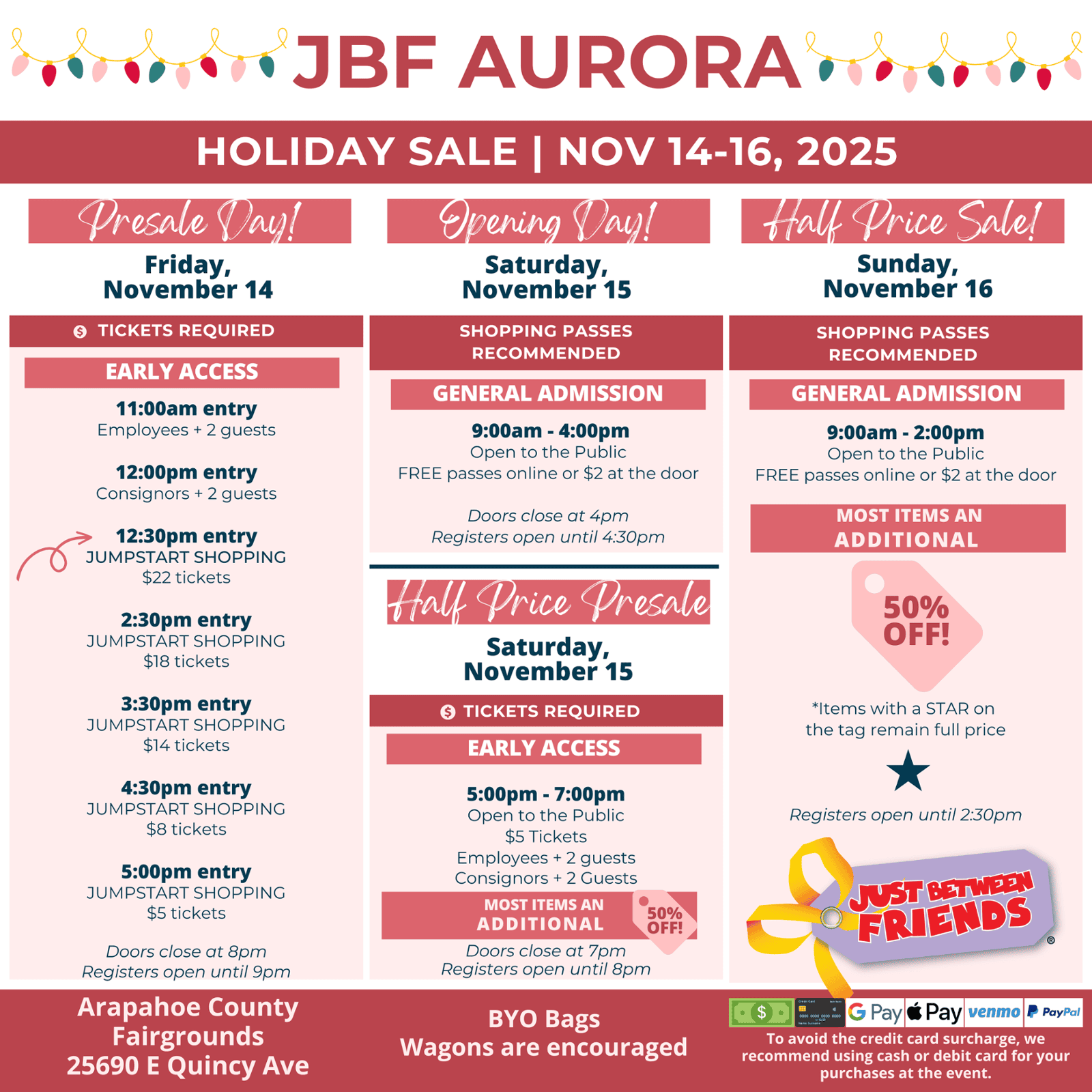Shopping retail means hours in a mall with bored, crying kids—spending way more than you planned. And garage sales or social media buying can be disappointing and frustrating when items or connections aren't what you hoped they'd be. Shop Just Between Friends Aurora pop-up sales to save hundreds of dollars on new and gently-used clothes, toys, shoes, books and gear for all sizes—infant to teen, plus maternity—all in one place. Items are inspected for quality and safety which means great items at huge savings. You get stylish, confident, good-looking kids while saving money and time. That's smart!