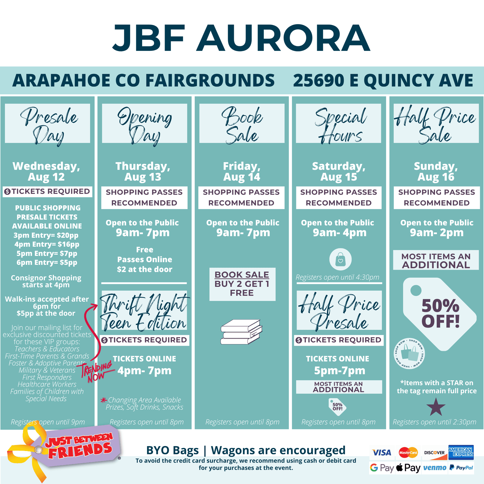 Shopping retail means hours in a mall with bored, crying kids—spending way more than you planned. And garage sales or social media buying can be disappointing and frustrating when items or connections aren't what you hoped they'd be. Shop Just Between Friends Aurora pop-up sales to save hundreds of dollars on new and gently-used clothes, toys, shoes, books and gear for all sizes—infant to teen, plus maternity—all in one place. Items are inspected for quality and safety which means great items at huge savings. You get stylish, confident, good-looking kids while saving money and time. That's smart!